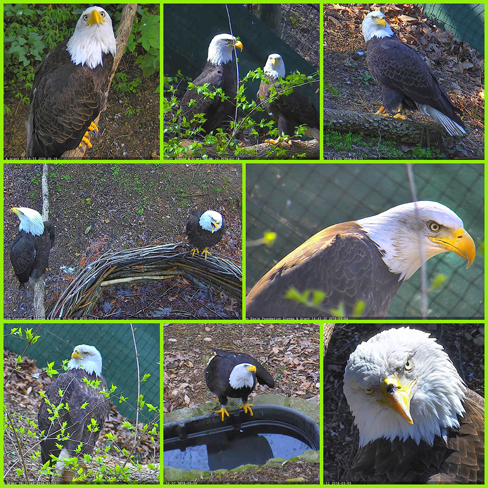 Glenda & Grant are permanently disabled, non-releasable Bald Eagles that were transferred to the American Eagle Foundation in Pigeon Forge. Both Glenda and Grant were residents in our Pick-a-Mate section. In 2017, it was observed that they had developed an attraction for each other. Following that observation, Glenda and Grant were removed from the Pick-a-Mate section and placed in their own private compartment on the Eagle Mountain Sanctuary. This season, their first together as a bonded pair, Glenda laid two eggs—March 11 and March 14. One egg was observed to be broken on March 19, and the other egg contained an underdeveloped eaglet which did not appear to be alive on cam April 20.